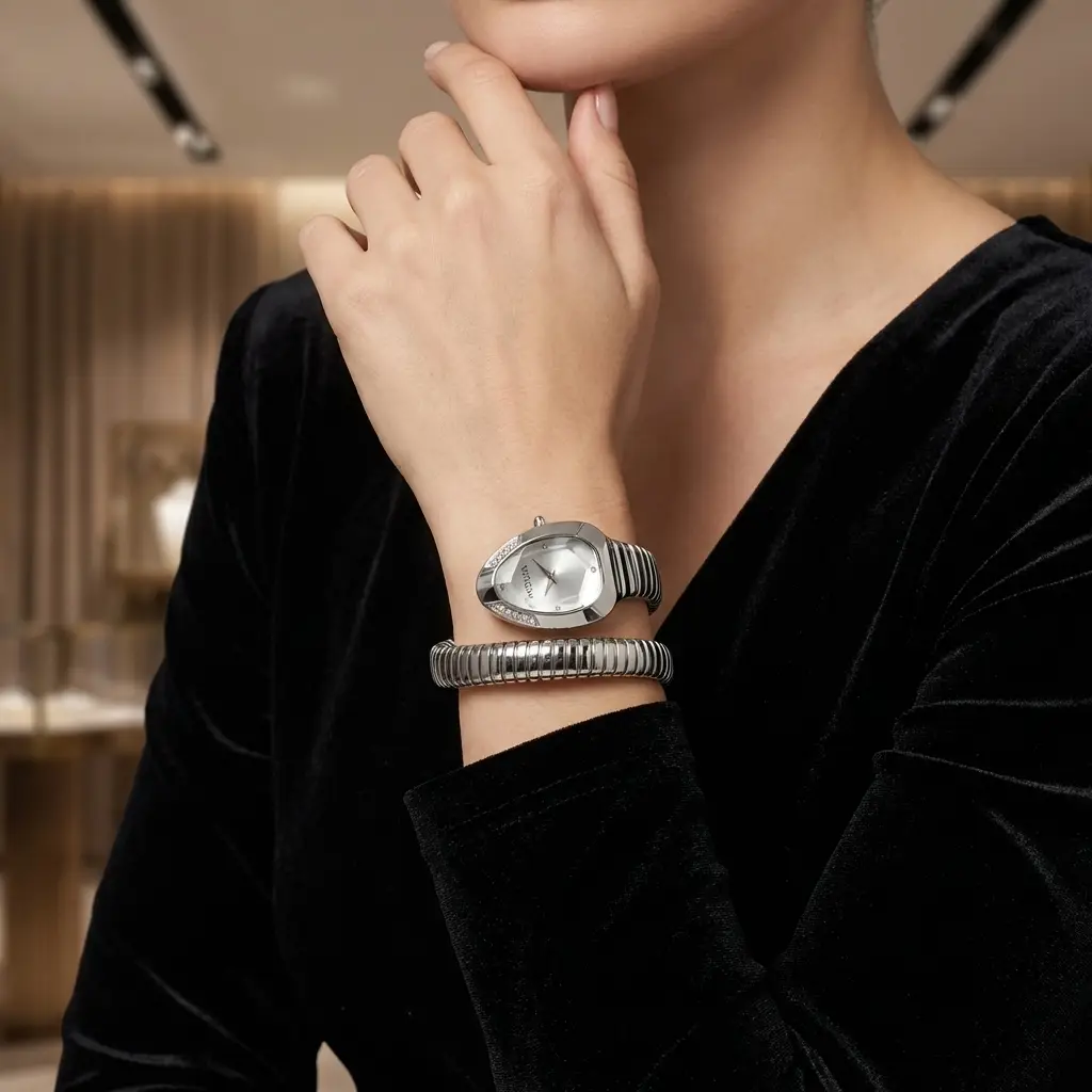 Our 11mm serpentine band is forged from high-grade 316L stainless steel, utilizing a specialized flexible core that ensures a secure yet gentle grip without the need for traditional clasps. Finished with a premium PVD coating for lasting luster, the band maintains its iconic silhouette while offering unparalleled comfort for the modern woman on the move.